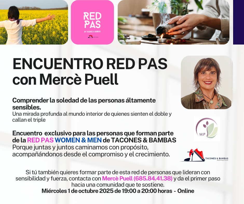 En la RED PAS de TACONES & BAMBAS creemos que liderar también es sentir. Por eso, hemos creado este encuentro exclusivo liderado por @mercepuell, experta en acompañamiento a personas altamente sensibles (PAS), para explorar una realidad que muchas veces se vive en si…[Leer más]1 ComentarioReaccionado por MERCÈ PUELL ELFA Y 1 Otro -